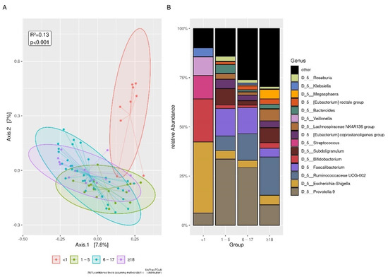 Differences between age groups. (A): UniFrac distances among infants and other age groups. The samples were visualized using principal coordinate analysis (PCoA). Differences with other age groups are statistically significant. (B): The plot of top 15 relative bacterial abundances at genus level. The statistical significances are shown in Table S1A.