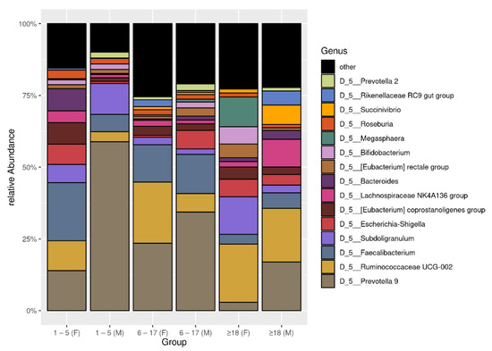 Overall, a significant difference in Faith’s phylogenetic diversity (PD) between 36 females (16.56 (0.9572–29.68)) and 40 males (12.22 (1.6780–34.15)) (p < 0.05) was observed. Ruminococcaceae abundance was higher in females (0.41125 (0–0.912)) versus males (0.174875 (0–0.8527)) (p < 0.01) and the Ruminococcaceae UCG-002 genus abundance showed the same trend (p < 0.01). No significant differences in alpha and beta diversity were found between male and female infants. Among subjects of other age groups, only females aged 6–17 years old showed a PD index between (19.28 (12.50–29.68)) which was different compared to males of 1–5 years old (12.39 (7.27–15.23)) (p < 0.05) and 6–17 years old (13.07 (7.34–34.15)) (p < 0.05). Among subjects aged 1–5 years, there was a lower abundance of Prevotella 9 in females (0.003 (0–0.477)) compared to males (0.704 [0.012–0.741]) (p < 0.01). In the 6–17 years age group, there was a greater abundance of Ruminococcaceae UCG-002 in females (0.125 (0.009–0.827)) compared to males (0.015 (0–0.440)) (p < 0.05). Within subjects >18 years of age, there was a higher abundance of Megasphaera in females (0.017 (0–0.654)) compared to males (0.00 (0–0)) (p < 0.01). Between the age groups, only Prevotella 9 was less abundant in females >18 (0.002 (0–0.139)) versus males of 1–5 years of age (0.704 (0.012–0.741) (p < 0.01). The top 15 bacterial composition at the genus level was shown in Figure 2.