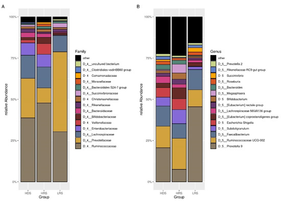 The plot of top 15 relative bacterial abundances. (A): the family level. (B): the genus level. The groups were based on the season of collection: the heavy dry season (HDS), heavy rainy season (HRS), and the low rainy season (LRS).
