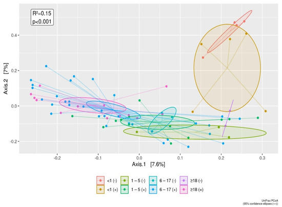 A marked difference in diversity was found between infants compared to the other age groups (Figure 1A). Infants showed a significant lower alpha diversity, in particular when compared to those aged 6–17 and >18 years (Table 4).