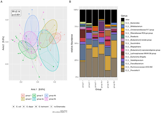 Beta diversity analysis in presence of Blastocystis. Group1: control group; Group 2: positive only for Blastocystis; Group 3: positive for Blastocystis and Entamoeba spp.; Group 4a: positive for Blastocystis and pathogenic virus and bacteria; Group 4b: positive for Blastocystis and Entamoeba spp. and pathogenic virus and bacteria; Group 5b: positive for Blastocystis and Entamoeba spp. and G. duodenalis and pathogenic virus, and bacteria. (A) The UniFrac distances among groups, using principal coordinate analysis (PCoA). UniFrac showed low divergences along Axis 1 (8,6%) between people carrying Blastocystis and Entamoeba spp. (Groups 3, 4b, 5b) compared to the negative subjects (Group 1) and subjects carrying Blastocystis but not Entamoeba spp. (Groups 2 and 4a). (B) The plot of top 15 relative bacterial abundances at the genus level.