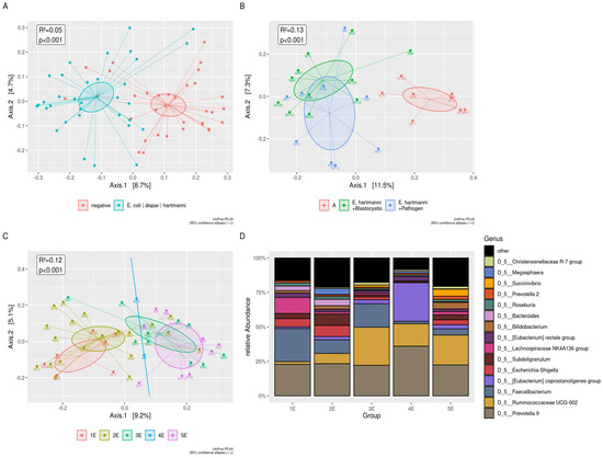 Beta diversity analysis in presence of Entamoeba spp. (A) The UniFrac distances between negative and positive subjects for Entamoeba spp., using principal coordinate analysis (PCoA) (B) The UniFrac distances among negative group, subjects harboring E. hartmanni and Blastocystis, and subjects harboring E. hartmanni, Blastocystis, and other pathogens, using principal coordinate analysis (PCoA). Group 1E: control group; Group: 2E: positive for pathogens not including Entamoeba spp.; Group 3E: subjects positive for En. coli and other pathogens; Group 4E: subjects positive for E. dispar and other pathogens; Group 5E: subjects positive for E. hartmanni and other pathogens. (C) The UniFrac distances among Group 1E, 2E, 3E, 4E, and 5E using principal coordinate analysis (PCoA). The groups carrying En. coli, E. dispar, and E. hartmanni (Groups 3E, 4E, and 5E), clearly were separated from groups not harboring Entamoeba species (Groups 1E and 2E). (D) The plot of top 15 relative bacterial abundances at the genus level. All the significances relating to (A–D) are summarized in Table S5D.