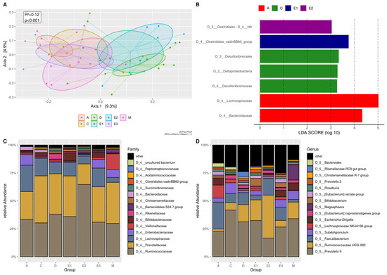 Beta diversity analysis showed: (i) a lower abundance for Bacteroides (p < 0.05) and for Lachnoclostridium (p < 0.01) in Group 3E versus Groups 1E and 2E; (ii) a lower abundance for [Ruminococcus] torques group in Group 3E versus Group 2E; (iii) an increased abundance for Ruminococcaceae UCG-002 and Ruminococcaceae UCG-010 (p < 0.05) in Group 5E versus Group 2E, and for Ruminococcaceae UCG-010 (p < 0.01) in Group 5E versus Group 1E (Figure 6C,D).