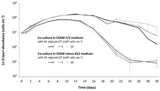 O. tauri RCC4221 growth in coculture with M. algicola OT MT023716. Cocultures were performed in complete ESAW- F/2 medium (solid curves) and in ESAW medium depleted in vitamin B12 (ESAW minus B12) medium (dotted curves).