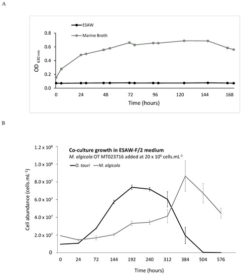 M. algicola OT MT023716 growth under different experimental conditions. (A) M. algicola OT MT023716 monoculture growth in ESAW-F/2 and marine broth media; (B) O. tauri RCC4221 and M. algicola OT MT023716 coculture growth in ESAW minus vitamin B12, showing that a sufficient number of O. tauri cells in stationary phase induces M. algicola OT MT023716 growth.