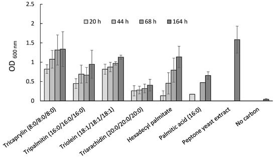 M. algicola OT (MT023716) was tested for its capacity to grow on palmitic acid (16:0), tricaprylin (TAG 8:0/8:0), tripalmitin (TAG 16:0/16:0/16:0), triolein (TAG 18:1/18:1/18:1), triarachidin (TAG 20:0/20:0/20:0) and hexadecyl palmitate (wax ester). Lipids were from Tokyo Chemical Industry Co. LTD, Tokyo, Japan. The strain was grown in marine broth (MB) overnight at 30 °C and resuspended at an optical density at 600 nm (OD600nm) of 0.1 in MB minimum [40]. Substrates were added at 0.1% (w/v) to the cell suspension in glass tubes and incubated at 30 °C under agitation at 150 rpm. Growth was monitored at 20, 44, 68 and 164 h by reading the OD600nm.