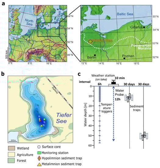 The hard-water oligo-mesotrophic Lake Tiefer See (near Klocksin; 53°35.5′ N, 12°31.8′ E; 62 m a.s.l.) is part of the southern Baltic Lake District and was formed during the final stage of the last glacial period (~13,000 years ago; Figure 1a,b; Supplementary Information). Lake Tiefer See is part of a subglacial gully system in a morainic terrain located in Nature Park ‘Nossentiner/Schwinzer Heide’. Lake Tiefer See has a surface area of approximately 0.75 km2, a catchment area of approximately 5.5 km2 dominated by glacial till and a maximum depth of 62 m with no major inflows or outflow. Lake Tiefer See has been the focus of an extensive and high-resolution climate monitoring program since the beginning of the last decade [27]. The lake is well-preserved and seasonally laminated sediments have aided climate reconstructions spanning the last 6000 years [28].