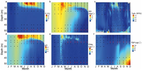 Physicochemical parameters from Lake Tiefer See: Heatmaps of physicochemical parameters for 2019 measured using a multi-parameter water quality probe in the water column of Lake Tiefer See showing (a) Temperature (T); (b) Dissolved oxygen (DO); (c) Turbidity (Turb.); (d) pH; (e) Chlorophyll-a (Chla), and (f) Total dissolved phosphorus (TDP). Data are interpolated for 1 d and 1 m water depth. Black circles and red squares represent the depths and timing of sampling of water and sediment traps, respectively.