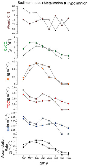 During the 1-year cycle, the overall suspended matter accumulation in the metalimnion sediment trap peaked from May to June at 3 g m−2 d−1. From October to November, particulate deposition at a water depth of 12 m decreased to ~1 g m−2 d−1 (Figure 3). In the hypolimnion, maximum particulate deposition was reached between June and July, with 4 g m−2 d−1 (Figure 3). The composition of the trapped material showed an overall contrasting value in the atomic C:N ratio during summer between the meta- (mean 7.5) and hypolimnion (mean 8.4), except in July when the ratio in both meta- and hypolimnion traps was 7.6 (Figure 3). In October and November, TOC, and TN fluxes at the bottom waters (hypolimnion traps) were practically absent, although fluxes of 0.2 g m−2 d−1 TOC and 0.02 g m−2 d−1 TN were measured in the metalimnion trap (Figure 3).