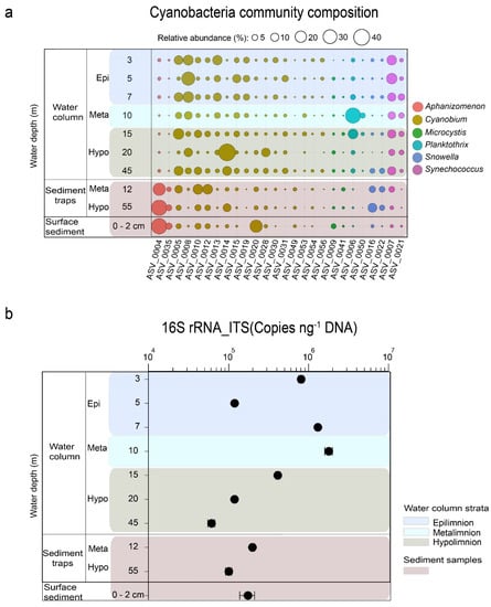 Cyanobacteria community composition and abundance in Lake Tiefer See water, trapped material, and sediments: (a) Bubble plot showing mean relative abundances for 2019 of the most abundant cyanobacteria amplicon sequence variants (>1% reads) in the water column, sediment traps and surface sediments, and (b) Mean cyanobacterial abundance for 2019 in the water column, sediment traps, and surface sediments quantified via qPCR with primers that amplified part of the 16S rRNA internal transcriber spacer (ITS) region of cyanobacteria (data were normalized to ng DNA extracted). Epi = epilimnion, meta = metalimnion, and hypo = hypolimnion.