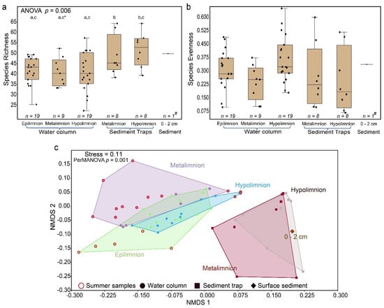 Alpha and beta diversity of cyanobacteria communities in Lake Tiefer See: Alpha diversity of cyanobacteria community composition in the water column, trap, and surface sediments where (a) ANOVA test for equal means on species richness followed by Tukey’s pairwise tests; a = non-significant zones in water column, b = non-significant zones in sediment traps, c = significance in hypolimnion traps, and * = marginal significance. # = one sample representing the mean of biological triplicates; (b) ANOVA test for equal means on Pielou’s species evenness among the groups was not significant p = 0.07, and (c) Visualization of beta diversity via a non-metric multidimensional scaling (NMDS) of cyanobacteria community composition in the water column, trap material, and surface sediments based on Bray–Curtis dissimilarity.
