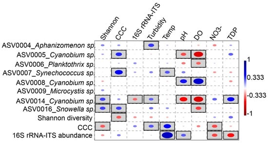 Correlation of pelagic cyanobacteria communities with environmental parameters: Rank-based Spearman correlation coefficients of the most abundant cyanobacteria ASVs, total cyanobacteria composition, and cyanobacteria 16S rRNA-ITS gene abundance with internal physicochemical properties in Lake Tiefer See. Gray-shaded squares are significant at p < 0.05 with Bonferroni p-value correction. Blue circles show positive, whereas red circles show negative correlations. Shannon diversity = cyanobacteria diversity, Temp. = temperature, DO = dissolved oxygen, NO3– = nitrate, TDP = total dissolved phosphorus, and 16S rRNA-ITS = 16S rRNA gene internal transcriber spacer (ITS) region of cyanobacteria.
