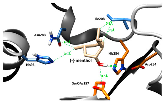 Interaction network for (–)-menthol within PestE (PDB code: 3ZWQ, [24]) based on a substrate docking. Residues interacting with (–)-menthol are shown in light blue, residues of the catalytic triad Ser157, His284, Asp254 are in orange. The model was created based on an acetylated Ser157.