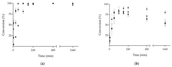 Enzymatic acylation of (±)-citronellol over time with (a) vinyl acetate and (b) ethyl acetate as acyl donors. Where: (●) PestE_wt; (■) PestE_H95A; (▲) PestE_I208A; (▼) PestE_N288F. Reaction conditions: Molar ratio 1:10 ((±)-citronellol:acyl donor), using 20 mM (±)-citronellol, 0.1% (v/v) Triton-X-100, 20 μg·mL−1 of the purified enzymes when ethyl acetate was used, or 0.2 μg·mL−1 of the purified enzymes when vinyl acetate was used, in 1 mL of an aqueous buffer (50 mM potassium phosphate, 300 mM sodium chloride, pH 8.0) at 1000 rpm and 40 °C. Reactions were conducted in triplicate, and the average values are shown. Reactions without enzymes did not result in ester products.