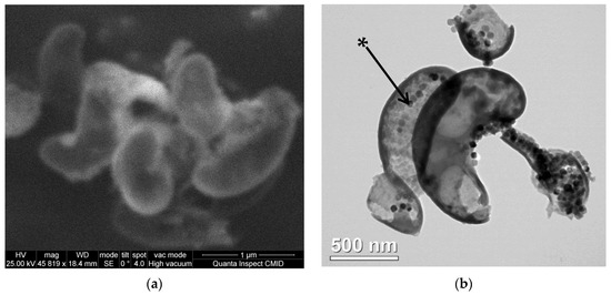 SEM and TEM images of the lyophilized Magnetospirillum caucaseum SO-1 are shown in Figure 1.