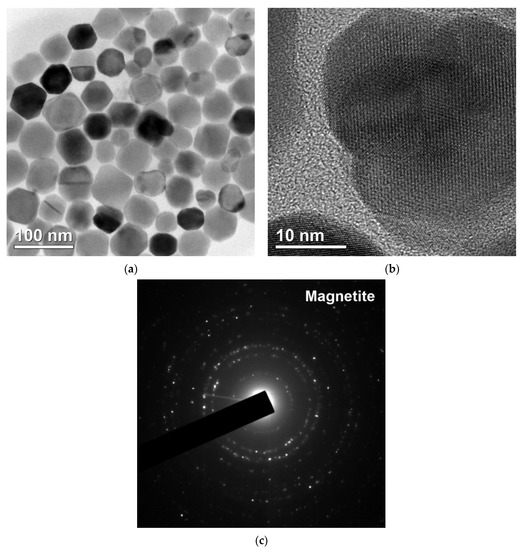 Transmission electron microscopy images of the isolated magnetosomes: (a) crystals of magnetosomes without membrane, (b) crystal lattice of an individual magnetite grain, (c) electron diffraction pattern.
