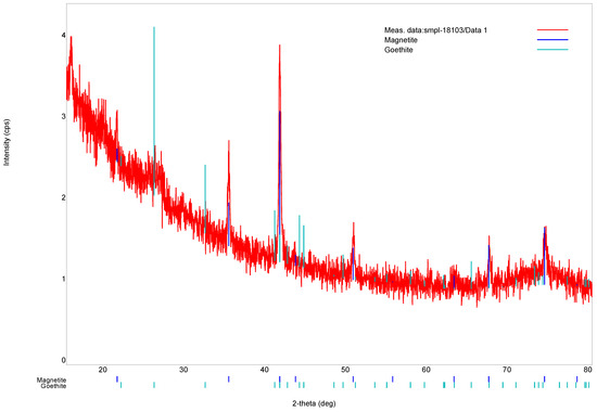 The size of single-domain magnetite of spherical shape is 29–36 nm [54]. In our case, grains have not spherical but parallelepipedal form and their characteristic size exceeds 40 nm. It should be noted that the presence of goethite according to the XRD data (see Figure 5) and the fact that the characteristic grain size exceeds the size of single-domain magnetite leads to nonuniform distribution of the magnetic moment in the grain. This leads to an underestimation of the spontaneous saturation magnetization Is of the grain. Taking into consideration the chemical and magnetic inhomogeneity of distribution of the magnetic moment in the grain and the relative contribution of the two types of aggregates to the magnetic parameters, based on the model of magnetostatically interacting two-phase particles [40,41], measurements of static hysteresis loops consistent with the experimental data were carried out (see Paragraph 3.2 and Figure 7) theoretical modeling of these parameters (Ms, Mrs, Hc Hcr).
