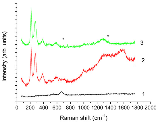 XRD results are confirmed by the Raman spectroscopy data (Figure 6). At the minimum laser power (curve 1, laser power 0.08 mW), a single band at 670 cm−1 was observed, attributed to A1g vibrations of magnetite [50]. Under the action of 0.8 mW power laser radiation (curve 2), annealing of the sample was observed, leading to the appearance of narrow lines in the range from 200 to 500 cm−1 and of broad bands between 1200 and 1650 cm−1. Presence of narrow lines with maxima near 220, 247, 412, and 498 cm−1 indicated the recrystallization of magnetite into hematite. The appearance of broad bands in the range from 1200 to 1650 cm−1, characteristic of various forms of carbon, may be related to the presence of organic matter. Further increase of the laser radiation power to 2 mW carried out for laser annealing of the sample (curve 3) similar to [50], led to a decrease in the intensity of the 1200 to 1650 cm−1 bands, likely caused by a partial removal of organic matter of magnetosomes membrane, whereas the lines characteristic of hematite remained unchanged.