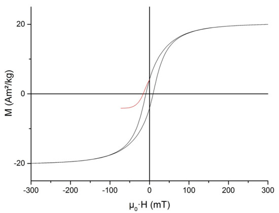 The static hysteresis loop and SIRM backfield curve measured at 295 K are shown in Figure 7. The hysteresis parameters were as follows: saturation magnetization was Ms = 20.46 Am2/kg; saturation remanent magnetization Mrs = 4.11 Am2/kg; their ratio (squareness) Mrs/Ms = 0.201; coercive force μ0Hc = 9.09 mT; remanent coercivity μ0Hcr = 16.03 mT; and ratio Hcr/Hc = 1.76. The value of saturation magnetization, Ms, was about 20% of the saturation magnetization of magnetite or about 26% of that of maghemite [53]. Hc and Hcr values lay in the range reported in the literature. On the other hand, the Mrs/Ms ratio was approximately two times lower than for magnetosomes isolated from cells of other representatives of the genus Magnetospirillum (Table 1) and was closer to that for synthetic interacting single-domain magnetite particles [54]. The main reason for this discrepancy seemed to be that in our samples, magnetosome chains were mostly dismembered and, in fact, we were dealing with nearly isometric clusters of magnetite particles (cf. Figure 3a).