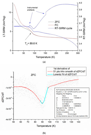 Another reason for a decrease of the Mrs/Ms ratio may be partial oxidation of magnetite grains, which manifested itself in a significant, down to 89.8 K, decrease in the Verwey transition temperature (Figure 8a) compared to the 125 K characteristic of stoichiometric magnetite [59].