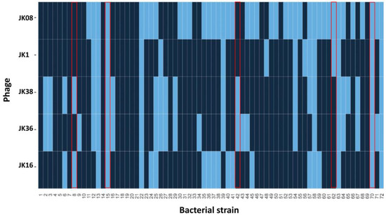 Heat map detailing the host range of phages JK1, JK08, JK16, JK36, and JK38 against the ECOR collection of 72 strains (numbered 1–72). Light blue indicates infection and dark blue indicates absence of infection. Host range data for JK16, JK36, and JK38 is adapted from [27]. Strains highlighted in a red box represent those selected for the infection model assays.