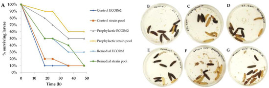 Evaluation of prophylactic and remedial phage therapy treatments of larvae infected with a single strain (ECOR62) or a mixture of five ECOR strains (n = 10). The number of surviving larvae after 48 h incubation at 37 °C was recorded and plotted (A). Controls in which the single strain ECOR62 alone (B) or strain combinations (E) were included. Prophylactic (C,F) and remedial (D,G) treatments of the single or combined strain pool, respectively, at an MOI of 100, were evaluated for their therapeutic potential. Prophylactic treatment was observed to be most effective in both single and mixed-strain assays. The number of larvae displaying melanization after the incubation period was recorded and plotted in the graph. Similar effects of the individual strain and strain pool were observed, while the larvae group treated with phages prophylactically displayed higher survivability and reduced melanization compared to the control and remedially treated cohorts. Panels (B–G) represent the results at the 16 h time-point.