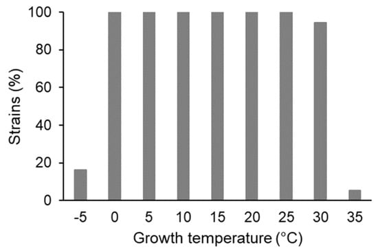 In adaptation to the site-specific climate conditions, the majority of the strains (94.5%) were able to grow well over a broad temperature range from 0 °C to 30 °C, among them all representatives of genera Pseudomonas and Collimonas. Remarkably, seven of the 13 Pseudomonas representatives were able to grow at −5 °C. Only two other strains, Chryseobacterium and Sporosarcina, could grow at this low temperature. Microbial growth and activity at subzero temperatures have been reported for a wide variety of microorganisms from cold ecosystems [].