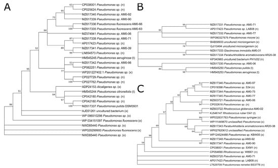 Phylogenetic tree of the studied (A) catechol-1,2-dioxygenase (B) multicomponent phenol hydroxylase and (C) protocatechuate-3,4-dioxygenase gene sequences. Strain numbers and accession numbers from GenBank are indicated. (n) and (x) indicate closest sequences based on NCBI blastn and blastx. (t) and (l) indicate published sequences by [,]. Bootstrap probabilities are shown at the branch nodes.
