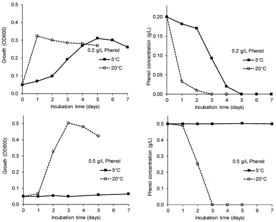The phenol degradation potential of strain AM0-06 (Pseudomonas sp.) was tested in the liquid culture at 5 °C and 20 °C. A concentration of 0.2 g/L phenol was almost fully degraded after one day at 20 °C, whereas complete degradation at 5 °C was detected after five days (Figure 4). The higher phenol concentration (0.5 g/L) was degraded at 20 °C within three days, while no degradation could be observed at 5 °C. Concentrations of 0.75 and 1.0 g/L phenol were not utilized at any of the tested temperatures within 15 days.