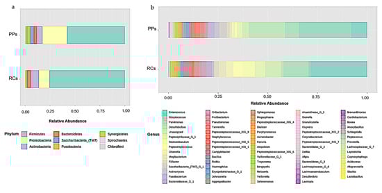 Illumina sequencing of 16S rRNA V3-V4 region amplicon libraries generated from RCs and PPs (n = 12) generated 1,792,885 raw reading pairs, of which 568,522 passed the quality control steps. After clustering the OTUs, the data were normalized to 39,544 reads.