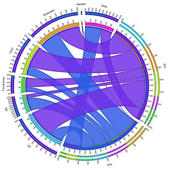 Distribution of the reads in the root canals (RCs) and periodontal pockets (PPs) accord-ing to phenotypic characteristics of the taxa present at the both sites, such as Gram-positives, Gram-negatives, rods, cocci, aerobes, facultatives and anaerobes. Data visualization was done through Circos software. The thickness of the bars, as the outer ring represents the percentage of readings in each study condition.3.2. Analysis of alpha and beta diversity in the RCs (represented in blue) and PPs (represented in purple) microbiomes.