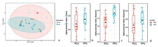 A study of beta microbiota diversity of RCs and PPs (Figure 3a) presented a similar overlap profile, with much less pronounced variations between comparisons. OTUs observed in RCs were much smaller than in PPs (Figure 3b). The Shannon index (Kruskal-Wallis test; p < 0.05) revealed a microbiota with much more pronounced values in PPs, which reveals the greater diversity of taxa found; it is noteworthy that the microbiota of both the sites was more diverse when considering the Shannon-Weaver values (Figure 3c). Species richness studies (Chao1) revealed a profile similar to that of Shannon’s studies, where PP cases stood out in relation to RCs (Figure 3d).