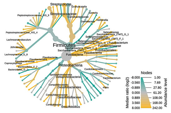 The abundance of taxa corroborates the data described in Figure 2, where Cardiobacterium, Streptococcus, Campylobacter, Pseudomomas, among others, are represented by the line and nodes in the green color, which indicates greater abundance in CRs (Figure 3), whereas the PP microbiota has high prevalence of Fusobacterium, Streptococcus, Capnocytophaga, among others, visually represented in yellow lines and nodes. Figure 3 clearly represents that there are more genera identified in PPs than in RCs, as there are a larger number of yellow nodes than green nodes.
