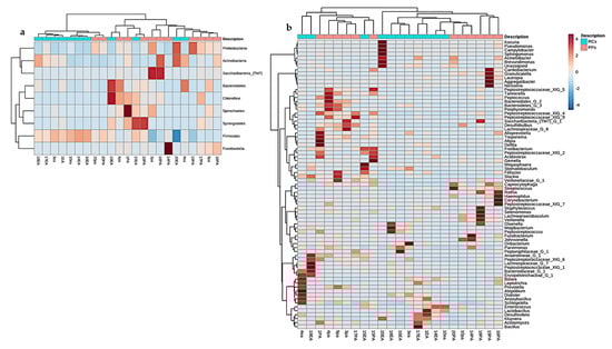 Heatmap containing similarities of the (a) phyla (b) genera in root canals and periodontal pockets. Red bars represent categories of phyla with the highest prevalence in the 12 samples of each site analyzed with a diversity pipeline.