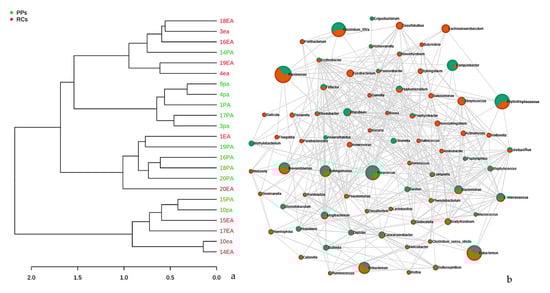 (a) Dendrogram showing the similarities between the samples of RCs and PPs. The dendrogram was created using the Jaccard index as a distance measure and Ward’s clustering algorithm considering a 1000-repetition bootstrap. (b) Correlation and co-occurrence analysis of cases of root canals (green) and periodontal pockets (orange) genera. The interactions (connections) represent the relationship (Spearman’s ρ > 0.6) and the significance (p < 0.01). Circles represent the relative abundance of each condition of study; the thickness of each connection between two nodes is proportional to the value of Spearman’s correlation coefficients.3.4. Metabolic prediction in RCs and PPs.