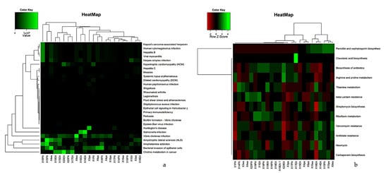 Functional prediction was performed using Tax4Fun2, a unique tool for predicting and investigating the functional profiles of prokaryotic communities based on sequencing data from the 16S rRNA gene. Metabolic prediction analysis identified 376 pathways in RCs and PPs. Figure 7 illustrates the grouping based on the functional profiles of each sample. The RC cases presented a large number of taxa noted mainly for biofilm formation, resistance to beta-lactams, amino acid biosynthesis and antibiotic biosynthesis. The distribution of the identified pathways is shown in Figure 8a.