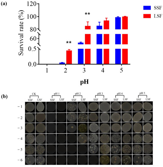 Differences in acid tolerance of L. paracasei Zhang cultured from solid-state fermentation and liquid-state fermentation. (a) Survival rate of solid-state and liquid-state fermented cells under different pH values; (b) Plate diagram of solid-state and liquid-state fermented cells under different pH values. Three biological and three technical replicates were measured. ** statistically significant differences (p < 0.01).