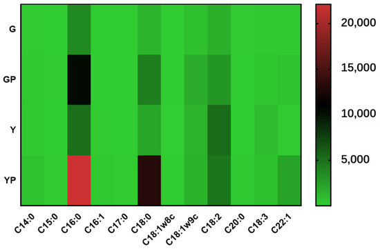 Heat map of fatty acid composition in cell membrane. G, solid state-fermented cells; Y, liquid state-fermented cells. GP, solid state-fermented cells treated with pH 2 for 10 min; YP, liquid state-fermented cells treated with pH 2 for 10 min. The numbers on the right side indicate the fatty acid content (μg/g). Results are based on three technical replicates.