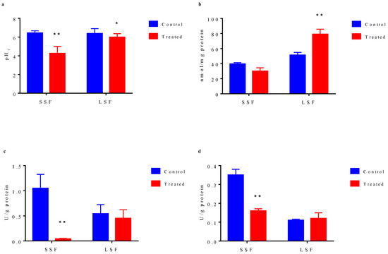 Physiological characteristic differences of cells cultured from solid-state fermentation and liquid-state fermentation. (a) Changes in intracellular pH. (b) Intracellular ATP concentration. (c) Activity of ATPase. (d) Activity of glutathione reductase. In bar chart, blue bar represents the cells without acid stress treatment, red bar indicates the cell exposed to pH 2.0 acid stress for 10 min. The results represent the mean of three duplicate experiments for each sample. Error bar indicates the mean ± standard deviation of three biological and three technical replicates. * statistically significant differences (p < 0.05) **, statistically significant differences (p < 0.01).