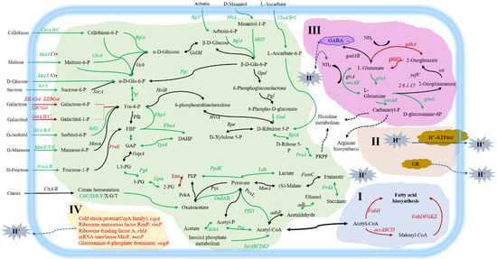 Schematic diagram of metabolism differences and acid stress tolerance mechanisms of L. paracasei Zhang obtained from LSF. The serial number (I, II, III, IV) indicates the acid stress tolerance mechanism of cells from LSF. (I) improving fatty acid metabolic pathway and changing the composition of cell membrane fatty acid; (II) maintaining the stability of intracellular microenvironment, maintaining and increasing enzyme activity; (III) changing glutamate metabolism, producing ammonia and GABA to alleviate acid stress; (IV) upregulating the expression of several genes related to acid stress response. Glu-6-P, glucose-6-phosphate; Fru-6-P, fructose-6-phosphate; FBP, fructose-1,6-diphosphate; DHAP, dihydroxyacetone-phosphate; GAP, glyceraldehyde-3-phosphate; 1,3-PG, 1,3-diphosphoglycerate; 3-PG, 3-phosphoglycerate; 2-PG, 2-phosphoglycerate; PEP, phosphoenolpyruvate; GR, Glutathione reductase. Red color indicates up-regulation; black color represents no change; green color indicates down-regulation at mRNA level. The blue lines show transportation, neutralization, and other coping processes.