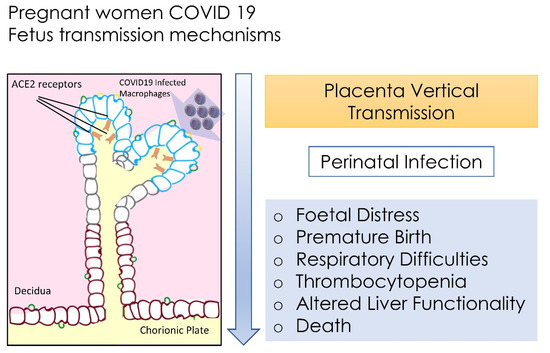 - Vivanti, A.J.; Vauloup-Fellous, C.; Prevot, S.; Zupan, V.; Suffee, C.; Do Cao, J.; Benachi, A.; De Luca, D. Transplacental Transmission of SARS-CoV-2 Infection. Nat. Commun. 2020, 11, 3572. [Google Scholar] [CrossRef] [PubMed]