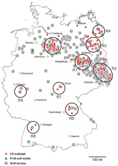 To date, the epidemiology of HS in Germany faces several open questions. In particular, the source of reintroduction of the infectious agent and its vehicle of spread over long distances are not known. Towards the end of 2017, we noted that HS outbreak sites might correspond to the habitats of wolves (Canis lupus) in Germany. This prompted us to investigate (i) the spatiotemporal relationship between known HS outbreak sites and established wolf territories; (ii) if wolves could harbour P. multocida capsular type B (PmB) in their nasal and/or oropharyngeal microbiota and, if so; (iii) the relatedness of these isolates with HS outbreak isolates in terms of clonal relationship and possession of virulence associated genes. In addition, to clarify their position in the worldwide epidemiology of HS, the genomes of German PmB isolates were compared to those of selected global HS-related isolates.