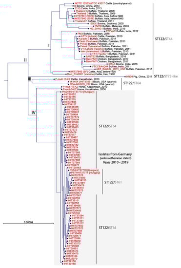A neighbour-joining phylogenetic tree based on the comparison of 1804 orthologous genes revealed that the German and Hungarian PmB isolates clustered separately from strains from HS cases in different Asian countries, the U.S.A., and Scotland (Figure 2). Principally, the strains were grouped following their multi-host MLST types. According to their general clustering, we differentiated four major groups (I–IV). The first group (I) included 29 global strains of ST44mh. The porcine ST73-likemh strain clustered separately (group II) and the third group (III) included three ST64mh strains from Kazakhstan and the United States. Group IV contained all 68 ST64mh and ST61mh PmB isolates from Germany and Hungary, and separated on another branch two ST64mh strains from horses isolated in Kazakhstan in the years 2006 and 2010 (P-mult-5-KZ, P-mult-15-KZ). Within group IV, all German and the two Hungarian isolates P56 (IHIT37770) and P57 (IHIT37771) differed by 0 to 6 SNPs in 1804 genes. For the third isolate from Hungary, Pm241 (IHIT37773), we could determine 15 to 18 SNPs difference to the other isolates of our study. The closest similarity between global strains and isolates from our study was determined for two PmB strains from horses (P-mult-5-KZ and P-mult-15-KZ) from Kazakhstan (67–71 SNPs).