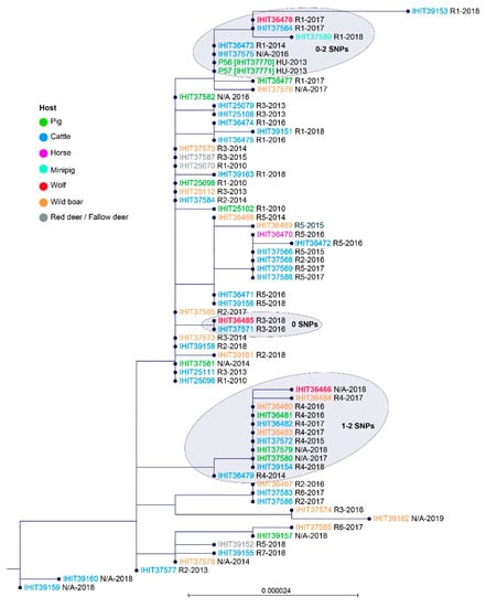 To further study the genetic relatedness of the isolates from wolves and other domestic and wild animals from Germany (and two very closely clustering isolates from Hungary), we performed a second comparison of the core genome of these 67 PmB isolates. Based on a core set of 2075 genes, maximum SNP difference within all but one of the German isolates ranged from 0 to 24 SNPs. In addition, the two isolates from domestic pigs in Hungary (P56 (IHIT37770) and P57 (IHIT37771)) fell into this range. We identified several isolates that shared 100% in nucleotide sequences of their core genome (Figure 3). For example, in R5, isolates from five cattle (2015–2017) and one horse (2016) showed zero SNPs. Another group of genetically identical isolates comprised of three cattle, a domestic pig, and two European wild boars from R4 between 2015 and 2018, as well as two isolates from geographically more distant outbreaks (N/A) in domestic pigs in 2017 and 2018. The two Hungarian pig isolates, recovered in 2013, showed zero SNP difference to the German isolates IHIT36473 (cattle, R1) and IHIT37575 (cattle, R1) that were obtained in 2014 and 2016, respectively. Since a retrospective survey revealed no direct or indirect relations between the Hungarian pig farms and German outbreak sites, possible epidemiological links remain unsolved to date. Finally, another group of 13 isolates with identical core genomes included four animal species (domestic pig, European wild boar, fallow deer, and cattle) and was obtained from three different regional clusters (R1, R2, R3) but also two separated outbreak sites (N/A) between the years 2010 and 2018. The most separated isolate was IHIT39153 which was recovered from cattle in Germany in R1 in 2018, showing 28 to 43 SNPs difference in comparison to all other isolates, as depicted in Figure 3.