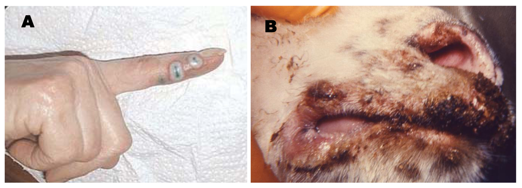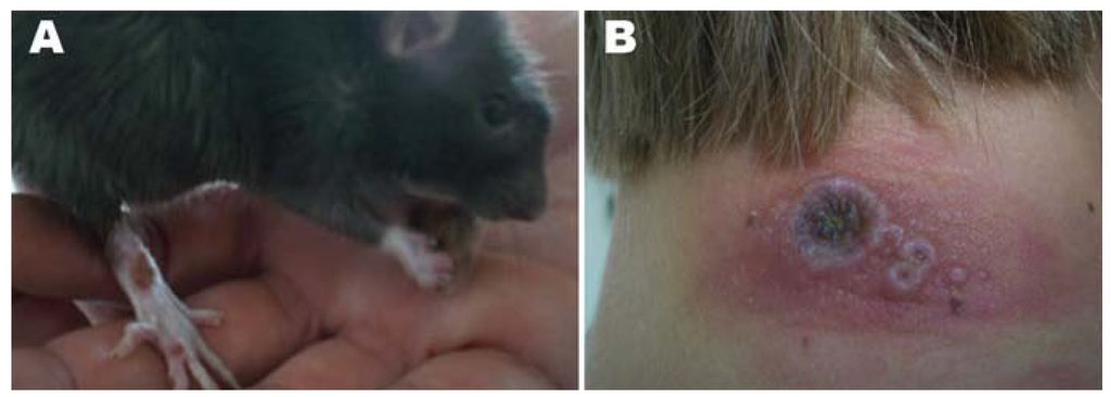 Infections in animals can be nearly asymptomatic or, at the other end of the spectrum, can result in death. Clinically significant cowpox has been recognized most often in Felidae sp, especially the domestic cat, but has also been described in the domestic dog, rats, monkeys, elephants, and other animals [,,,,-]. Most cats present with a generalized papular or vesicular rash which may have started as a single ‘bite-like’ lesion around the head, neck or forelimb approximately 1–2 weeks prior. Bacterial dermatitis is often suspected initially. Approximately 20% of infected cats will develop oral lesions, and 20% will have a mild upper respiratory tract infection with serous to mucopurulent nasal and ocular discharge similar to what is seen with calicivirus infections and feline herpes. Fatal outcomes in domestic cats have primarily been associated with underlying disease. However, underlying disease, such as feline immunodeficiency virus, does not always indicate a poorer prognosis []. Clinical signs in pet rats are primarily upper respiratory signs and death; however, skin lesions, particularly on the paws, have been reported in fancy rats (Figure 1) [-,]. Of the three reports in dogs, all infections have been single, ulcerated lesions [,]. Disease tends to be more severe and often results in death non-domestic animals such as lions (Panthera leo), anteaters (Mymecophaga tridactyla), ocelots (Leopardus pardalis), cheetahs (Acinonyx jubatus), monkeys and elephants [-,-,].