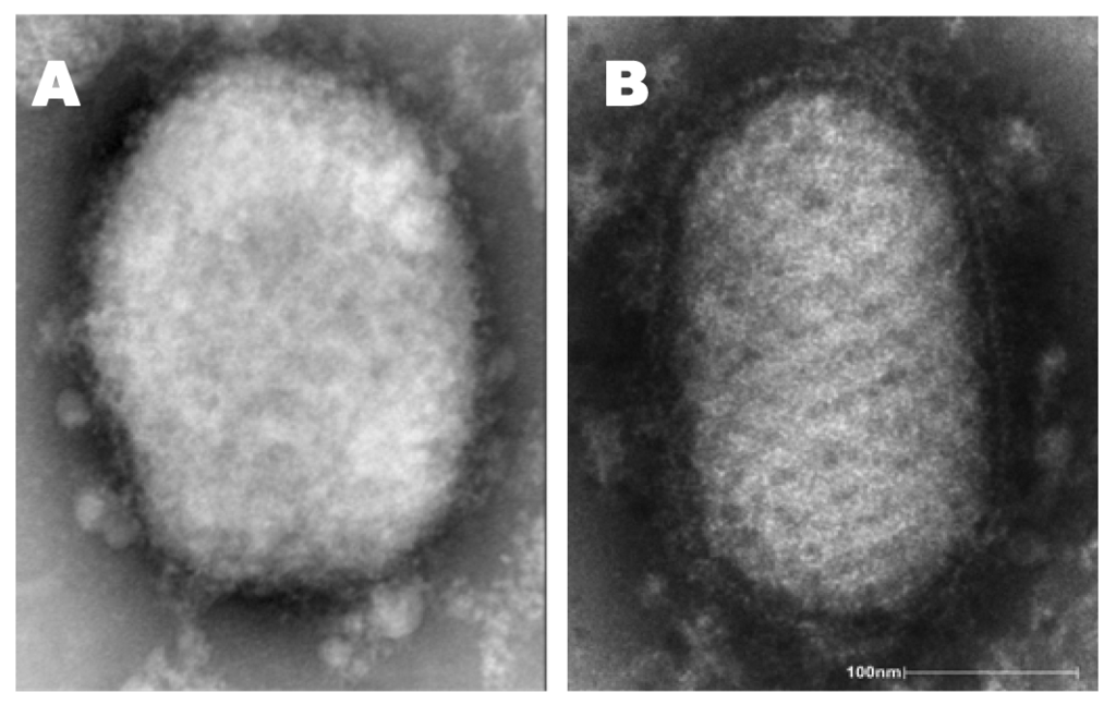 Diagnosis of some poxvirus infections can be made based on clinical features and case history alone. However, laboratory testing is needed to confirm infection. Because large quantities of virus can be found within lesions, vesicle fluid, crusts, or tissue biopsy are preferred as diagnostic samples. Electron microscopy and histopathology can also be helpful for confirming a diagnosis as poxviruses have distinctive morphology—large (approximately 300 nm diameter), box or ovoid shape, and outer membrane protrusions (creating a textured appearance)—and replicate in the cytoplasm of host cells [,,]. Parapoxviruses exhibit a unique oval shape and criss-cross pattern of the outer membrane (Figure 4(a,b)) [].