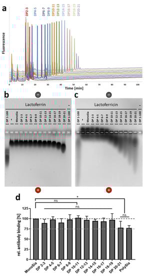 In comparison to lactoferricin (LFcin), higher degrees of polymerization (DPs) are needed for the interaction with lactoferrin. (a) The chain lengths of fractionated polysialic acid (polySia) were analyzed using “mild” dioxybenzene (DMB) labeling and anion-exchange chromatography. (b) Lactoferrin and (c) LFcin were incubated with polySia with chains of defined lengths, and the different samples were analyzed by native gel electrophoresis. In addition, unfractionated polySia (~DP 1–100) was used. Proteins were visualized by staining with Coomassie Blue. To exclude staining of polySia by Coomassie Blue, unfractionated polySia was separated without lactoferrin and LFcin. The gel was loaded with 10 µg/lane of lactoferrin or LFcin and/or 5 µg/mL of carbohydrate. (d) A competitive ELISA with an anti-LFcin antibody was performed by using sialic acid with chains of different lengths. Neu5Ac was used as a negative control and set to 100%. Mean values (n = 3) and standard deviations are displayed in the diagram. Statistically significant differences are indicated: nonsignificant (ns) and * p < 0.05.