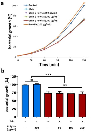 To prove the ability of polySia to influence the antibacterial properties of LFcin, both molecules were tested for their ability to inhibit the growth of bacteria. In bacterial growth assays, LFcin and polySia were separately tested, in addition to a combination of LFcin and different concentrations of polySia. As expected, bacterial growth was inhibited by LFcin (Figure 2a,b). In contrast, polySia had no statistically significant impact on bacterial growth (Figure 2b). Surprisingly, when LFcin was applied together with polySia, its antimicrobial activity was not influenced by polySia. The growth curves in the presence or absence of polySia were very similar, and no statistical differences were observed after 150 min.