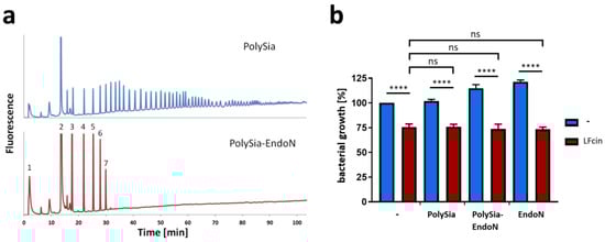 Bacterial growth inhibition by LFcin is not influenced by short sialic acid oligomers. (a) PolySia and polySia degraded by endoN were analyzed by anion-exchange chromatography after “mild” DMB labeling. (b) Bacterial growth values at 150 min are displayed using polySia (200 µg/mL) or enzymatically degraded polySia (200 µg/mL) in the presence or absence of LFcin (100 µg/mL). Untreated cells were set to 100%. Red bars show LFcin-treated samples, whereas blue bars represent data without LFcin treatment. Mean values (n = 3) and standard deviations are displayed in the diagram. Statistically significant differences are indicated: nonsignificant (ns) and **** p < 0.0001.