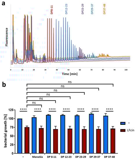Bacterial growth inhibition by LFcin is not influenced by different chain lengths of polySia. (a) Fractionated polySia samples with different degrees of polymerization (DP 8–48) were analyzed by using “mild” DMB labeling and anion-exchange chromatography. (b) Bacterial growth values after 150 min are displayed after treatment with LFcin (100 µg/mL) and defined polySia fractions (200 µg/mL). Control (without treatment) was set to 100%. Red bars show LFcin-treated sample datasets, and blue bars show sample datasets without LFcin treatment. Mean values (n = 3) and standard deviations are displayed in the diagram. Statistically significant differences are indicated: nonsignificant (ns) and **** p < 0.0001.